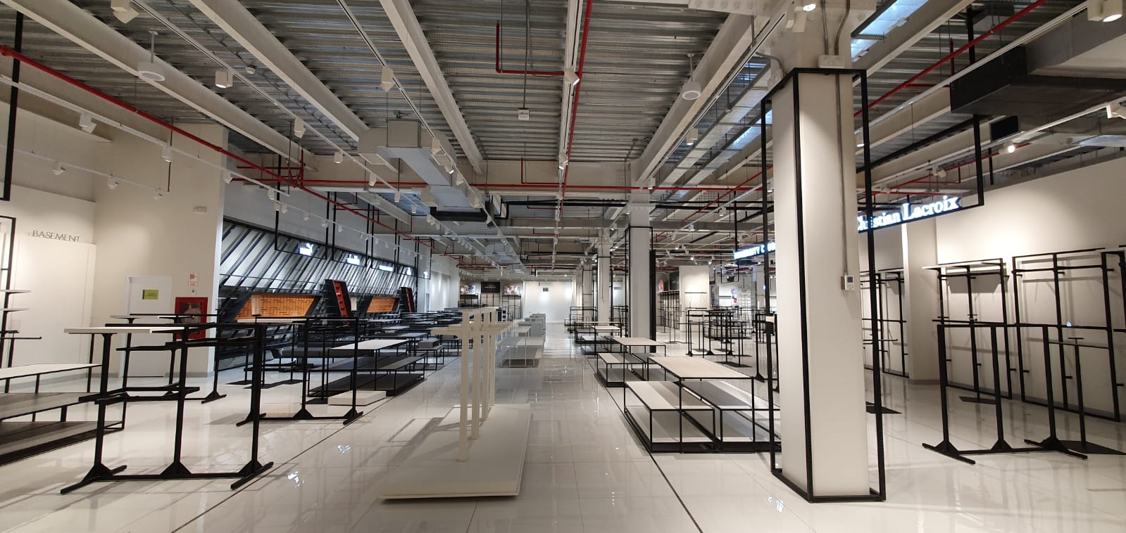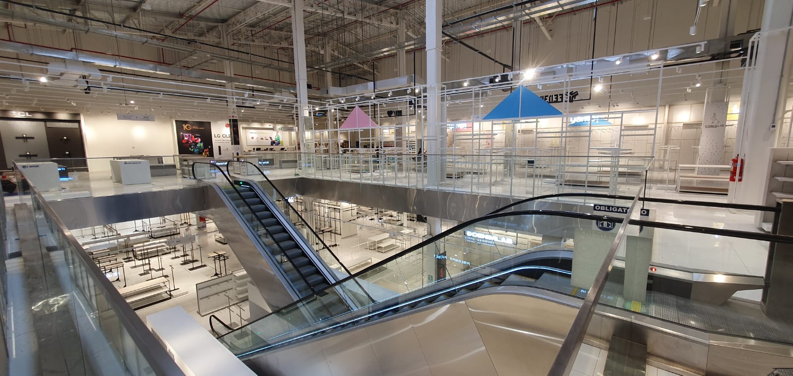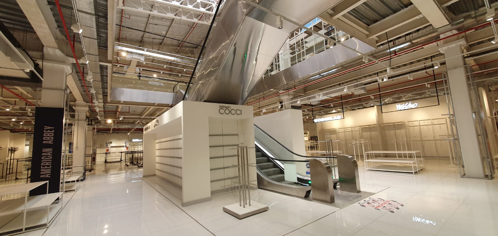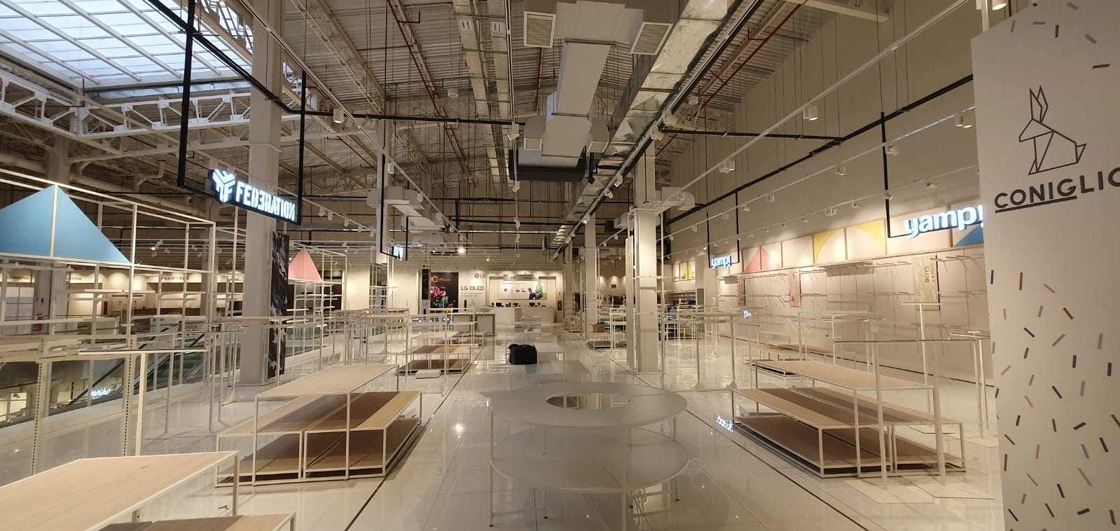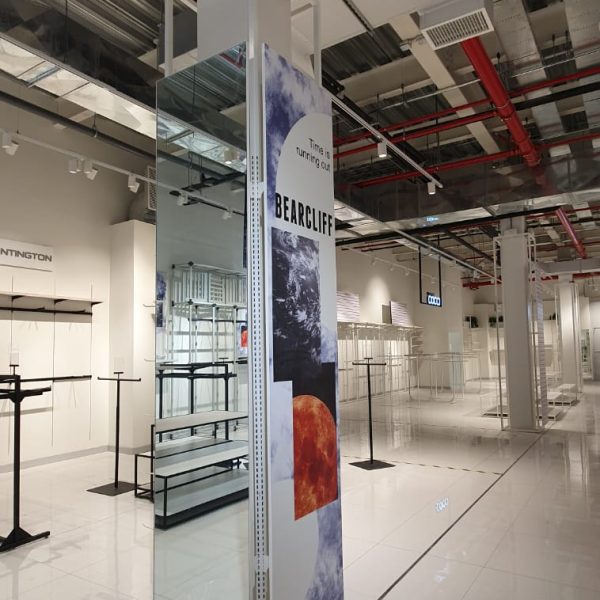 Se diseñaron elementos ligeros con estructuras metálicas en blanco y negro resaltando cada marca con logos iluminados y visuales de marcas.